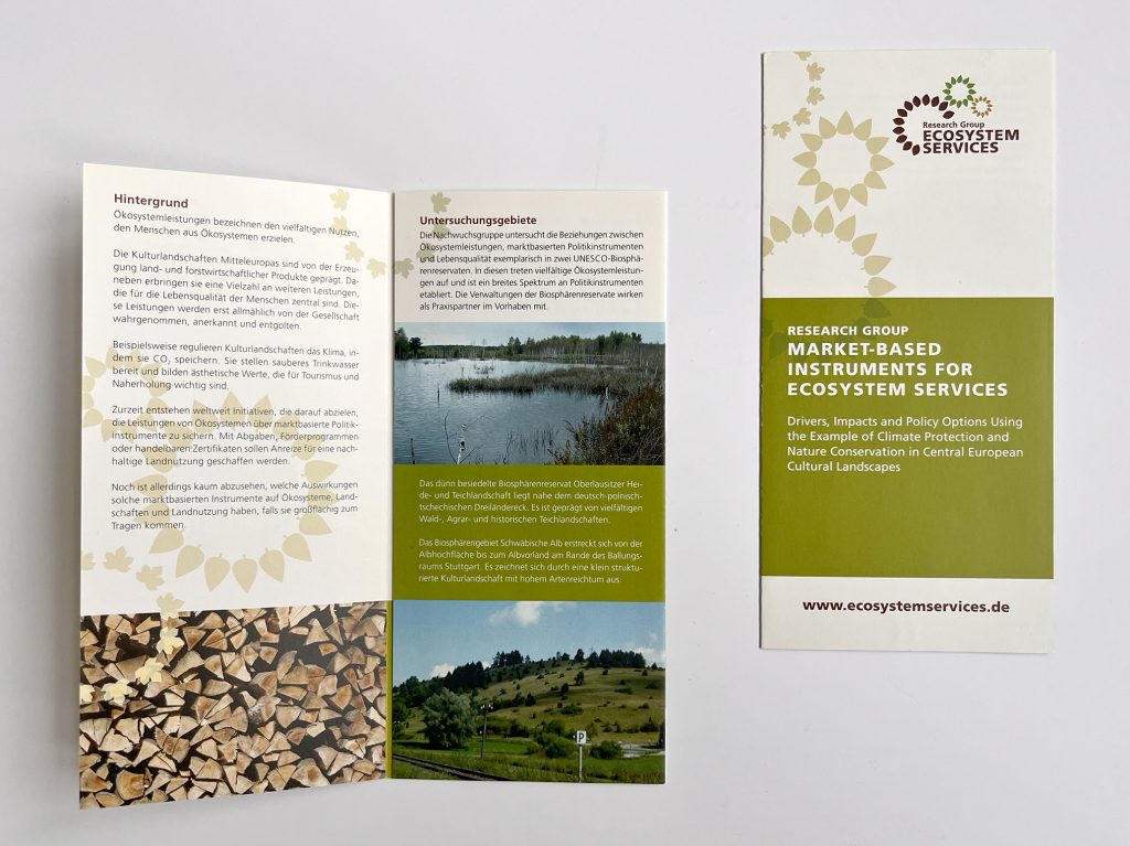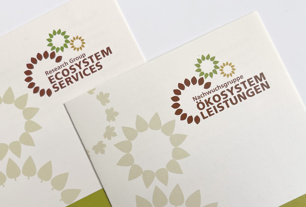 Die Wort-Bild-Marke verdeutlich Wechelwirkungen zwischen Ökosystemleistungen sowie sich beeinflusende Prozesse von marktbasierten Politikinstrumenten, Landnutzung und Ökosystemen. Wie die Zahnräder eines Uhrwerks greifen die sympolisch durch Blattformen dargestellten Ökosysteme ineinander.
