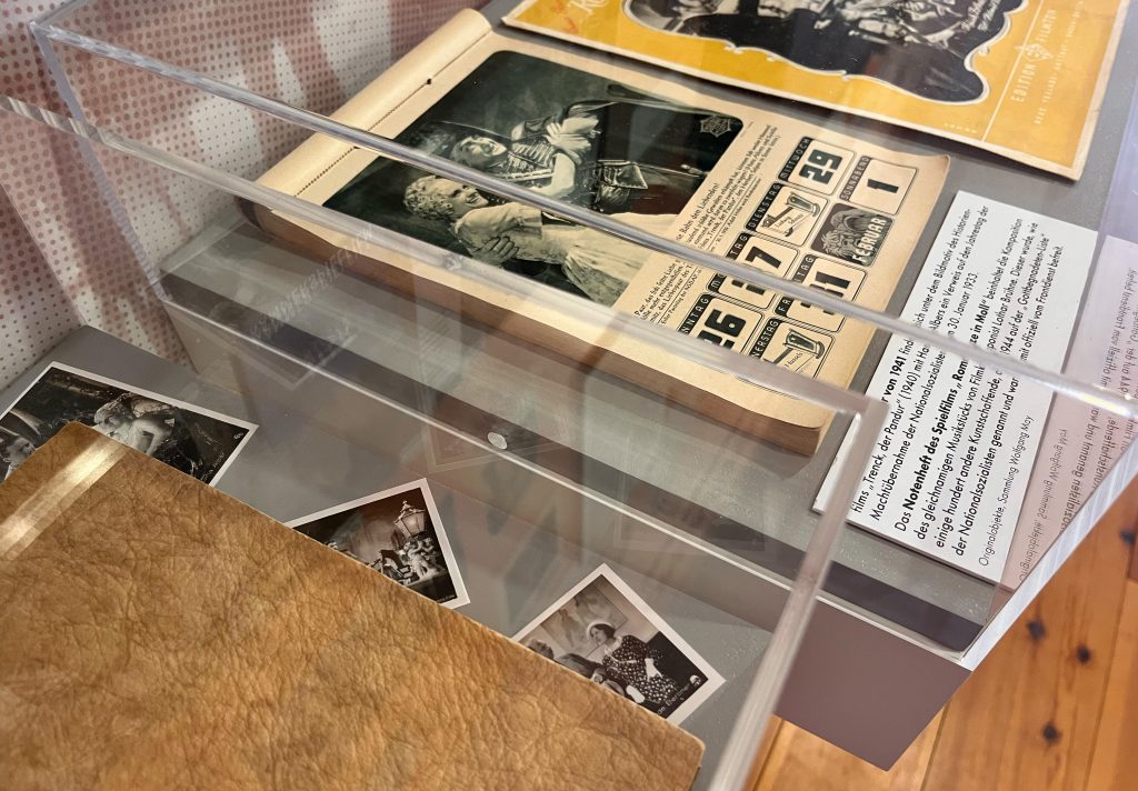 EIne Einleitungstafel wurde im Stil der bestehenden älteren Beschriftung erstellt. Drei Wandvitrinen und eine Sockelvitrine zeigen einige Leihgaben, wie Filmkalender und Bücher.